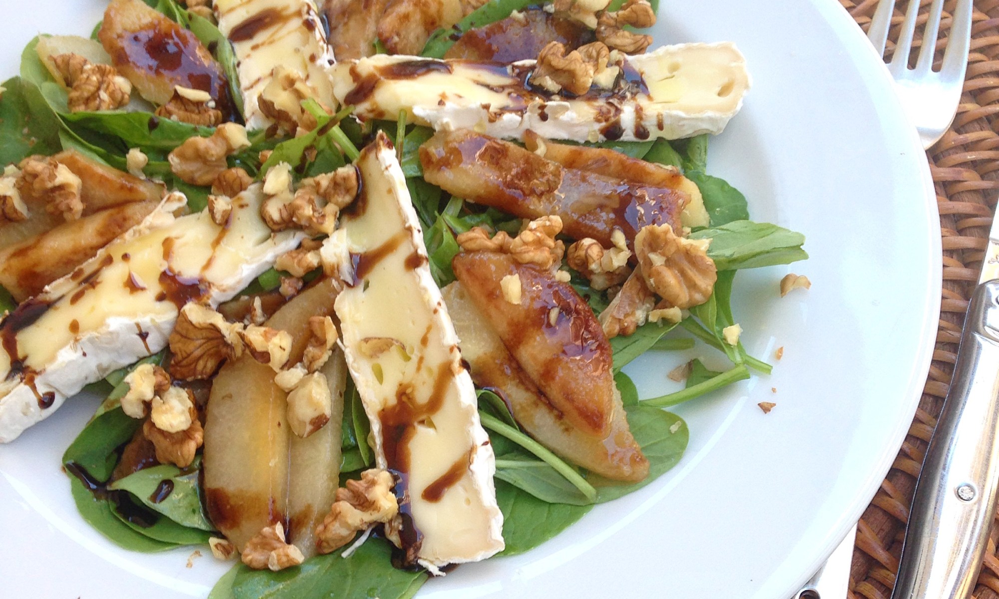 Ensalada de Rúcula, Peras Caramelizadas, Queso Brie y Nueces