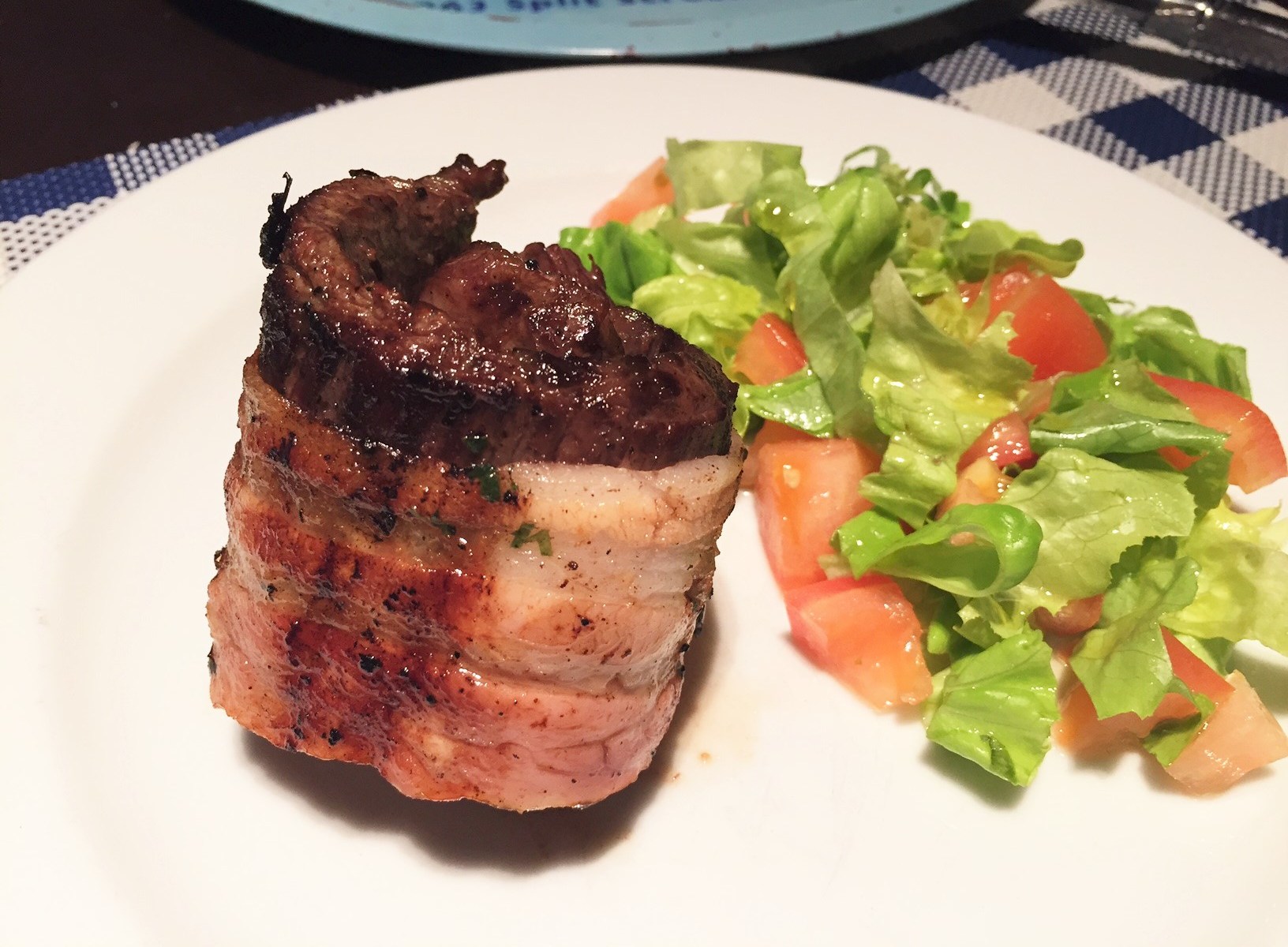 3. Con la entraña dorada y cuando baje un poco la temperatura para que la puedas manipular, estirala sobre las tiras de panceta y enrollala. Asegurala con un par de escarbadientes.