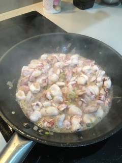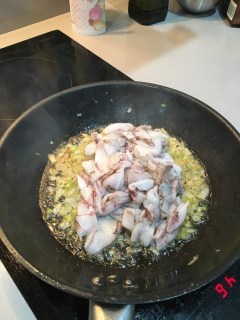 2. Una vez que está transparente, subí e fuego y agrega 400g de chipirones limpios y déjalos quietos hasta que se doren.