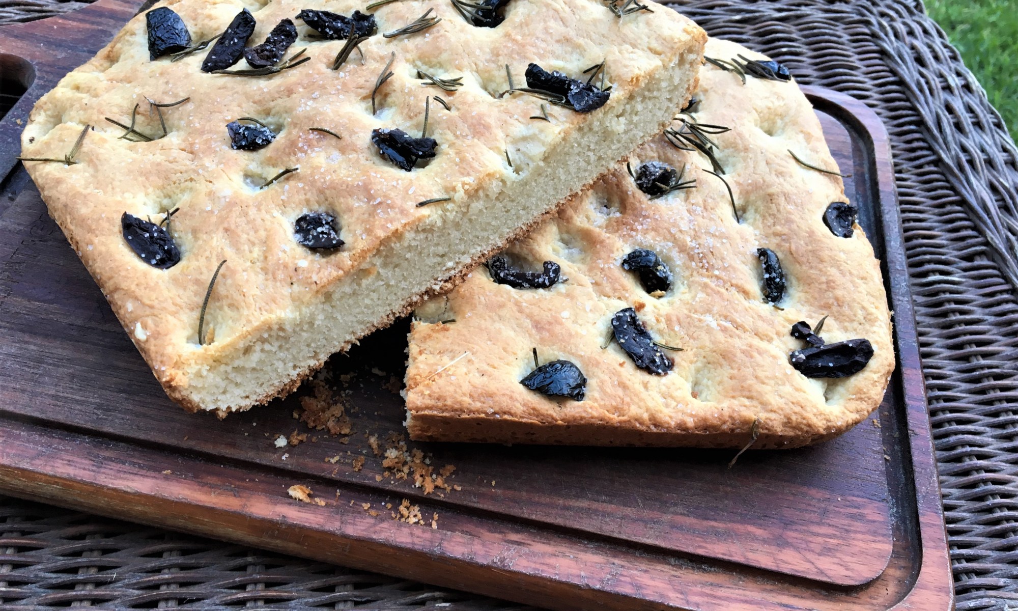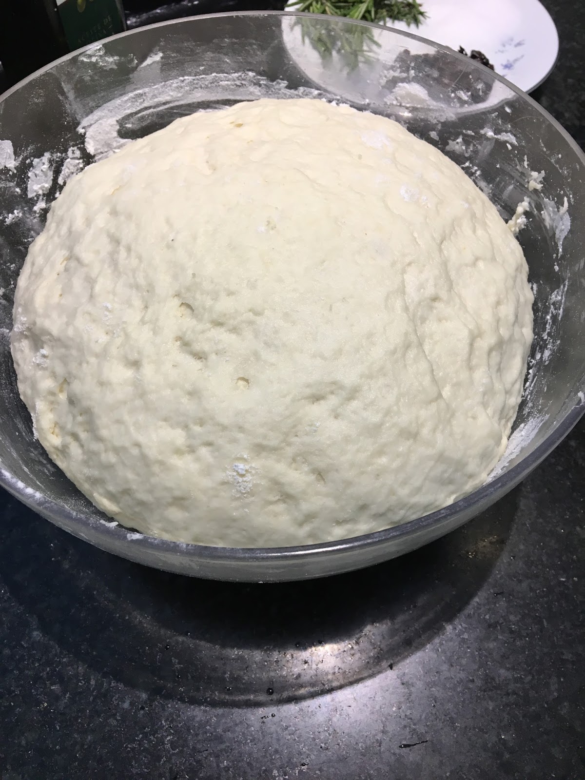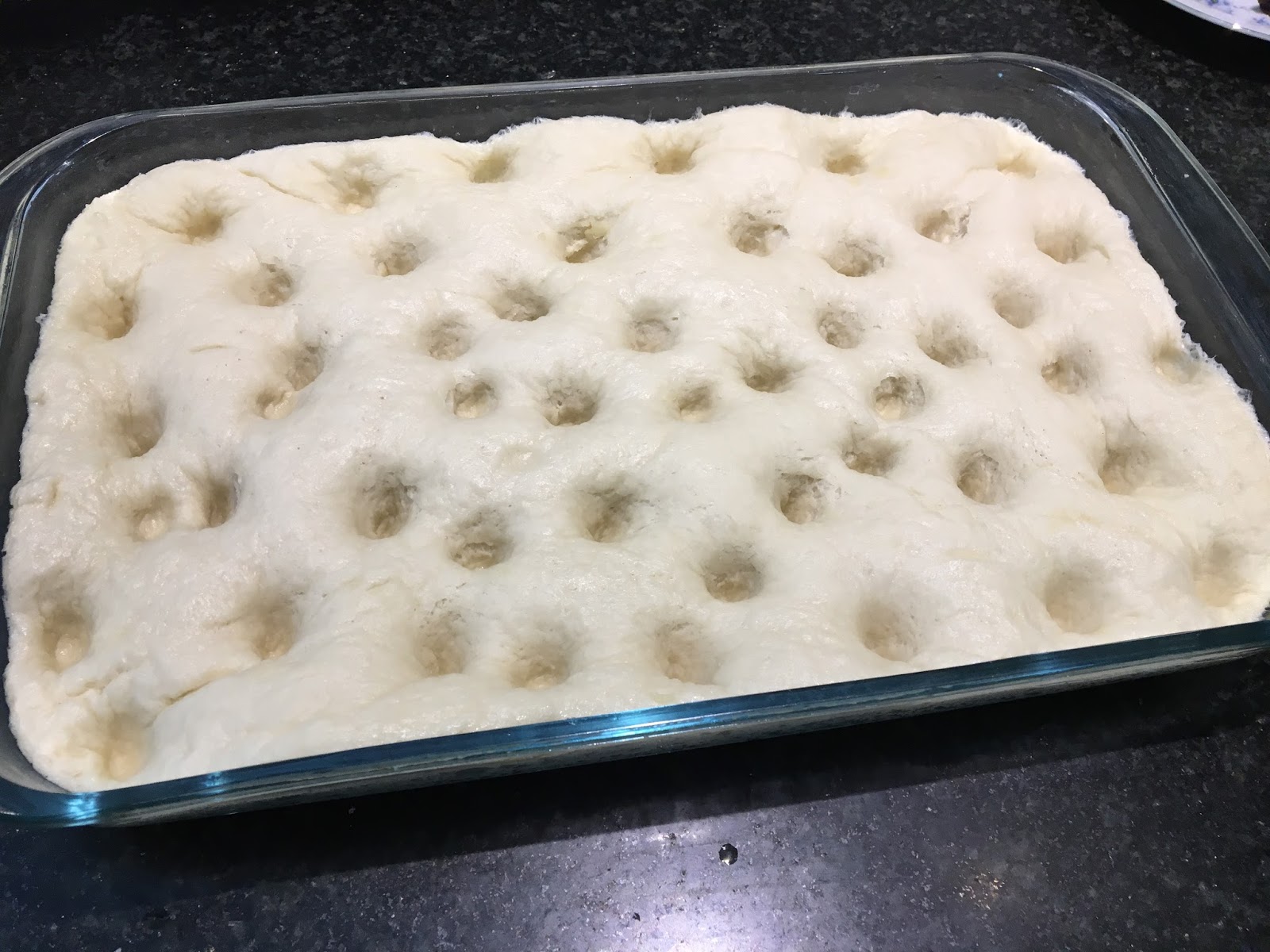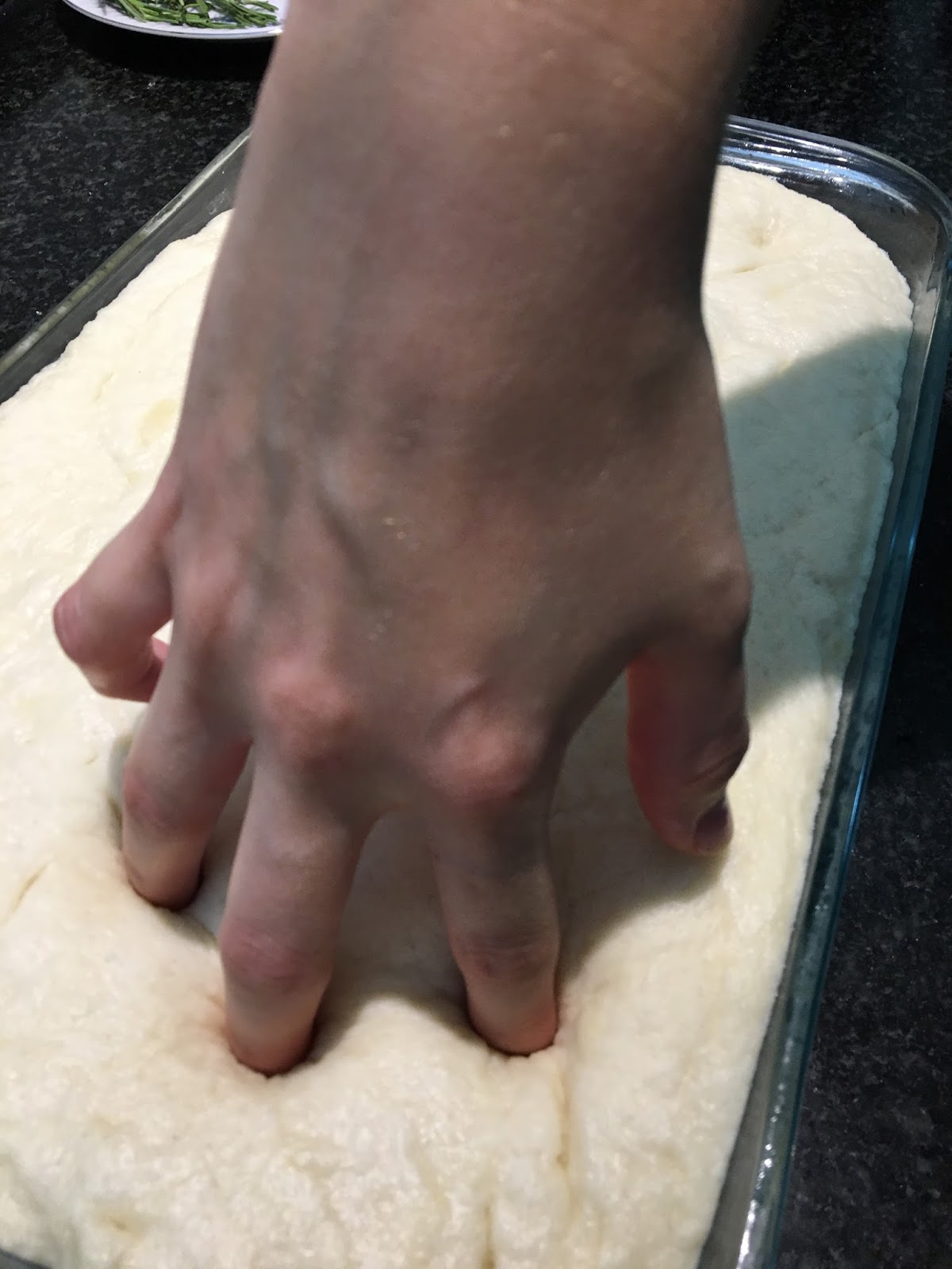 5. Una vez levada de vuelta la masa, hacele agujeros con los dedos, y hundí ramitas de romero o aceitunas cortadas. Espolvorea con un poco mas de aceite de oliva y sal gruesa.