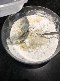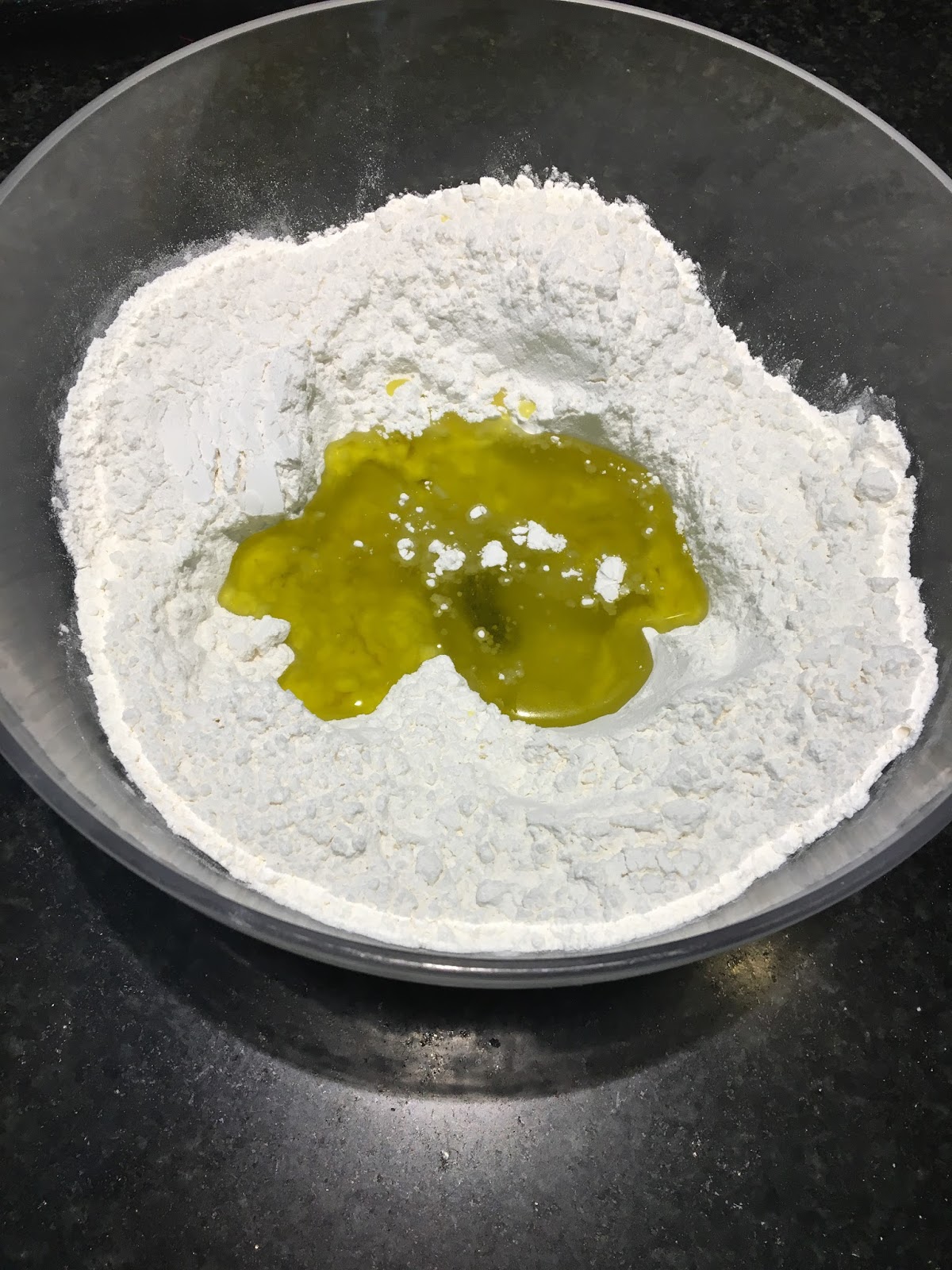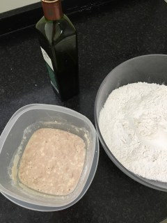 2. En un bowl grande o mesada directo, junta harina y sal y en el medio agrega el fermento y el aceite de oliva. Empezá a mezclar y agregale agua según necesite (media taza seguro), tiene que quedar una masa suave no dura pero tampoco pegajosa. Forma el bollo y empezá a amasar: presiona suavemente con las dos manos en el medio del bollo, estiralo para adelante, luego junta los costados llevalos al medio y repetí la operación hasta que la masa quede lisa (5/10mins).