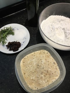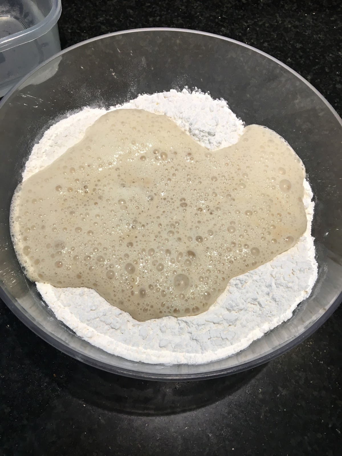 1. Armá el fermento previo; desgrana en un bowl mediano la levadura, agregale harina y azúcar, mezclé y agregale el agua, te queda una pasta ligera grumosa. Dejalo reposar (en un lugar cálido y sin corrientes de aire) hasta que duplique el volumen (20/25 minutos)
