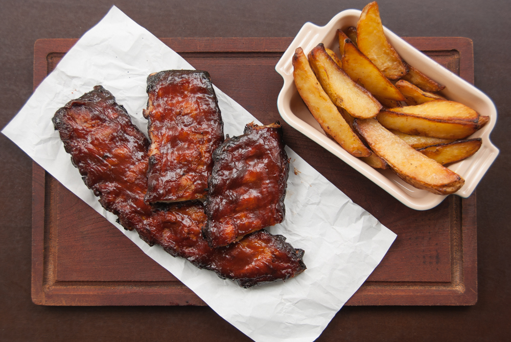 Una vez listas las costillas y las papas, serví todo en un gran plato o tabla con muchas servilletas, porque te van a quedar para chuparse los dedos!