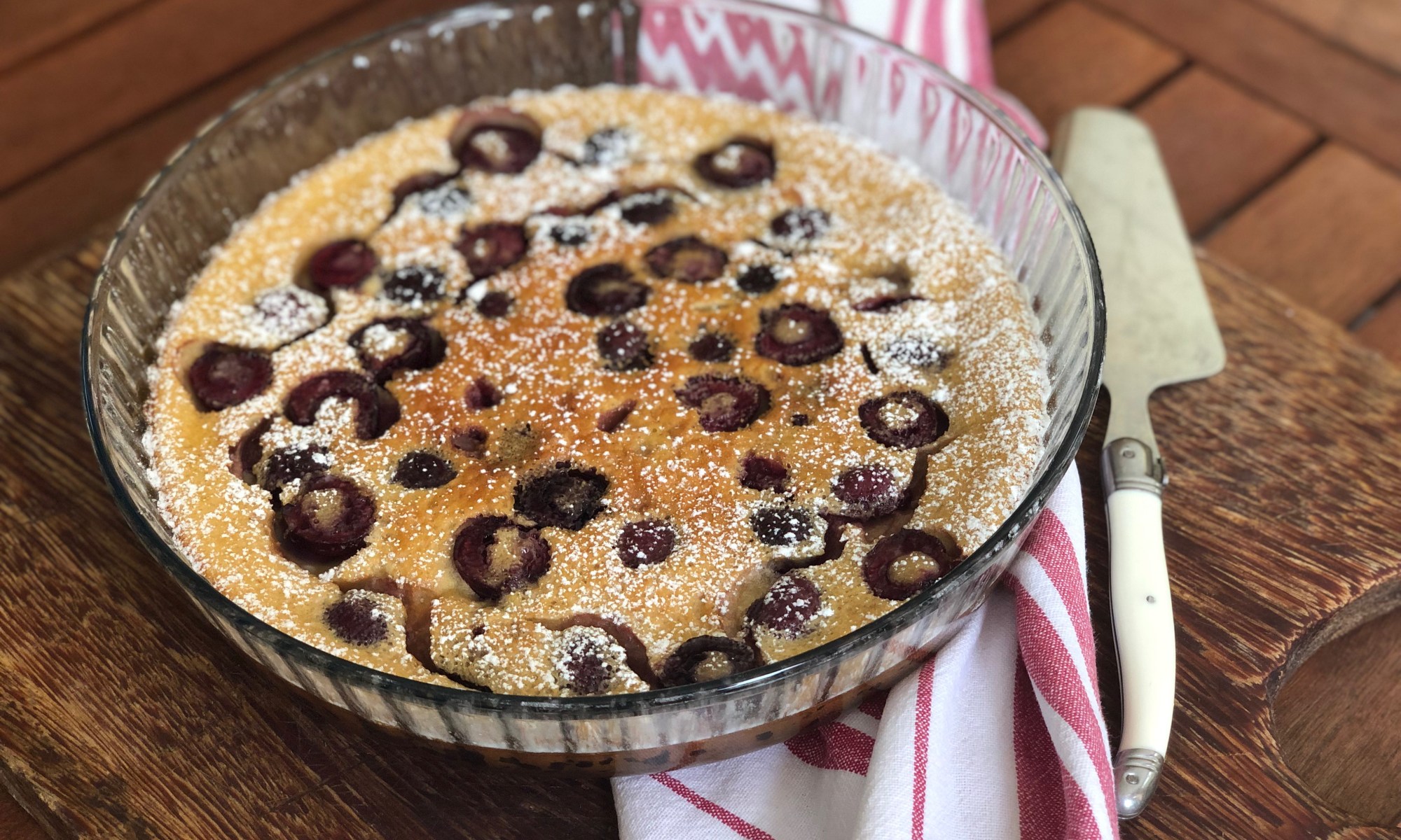 Lo bueno es que si no encontrás cerezas, lo podes hacer con cualquier fruta de carozo, ciruelas, pelones, duraznos o incluso con arándanos por ejemplo. De todas las recetas que busque esta fue la que más me resultó, que es de Julia Child