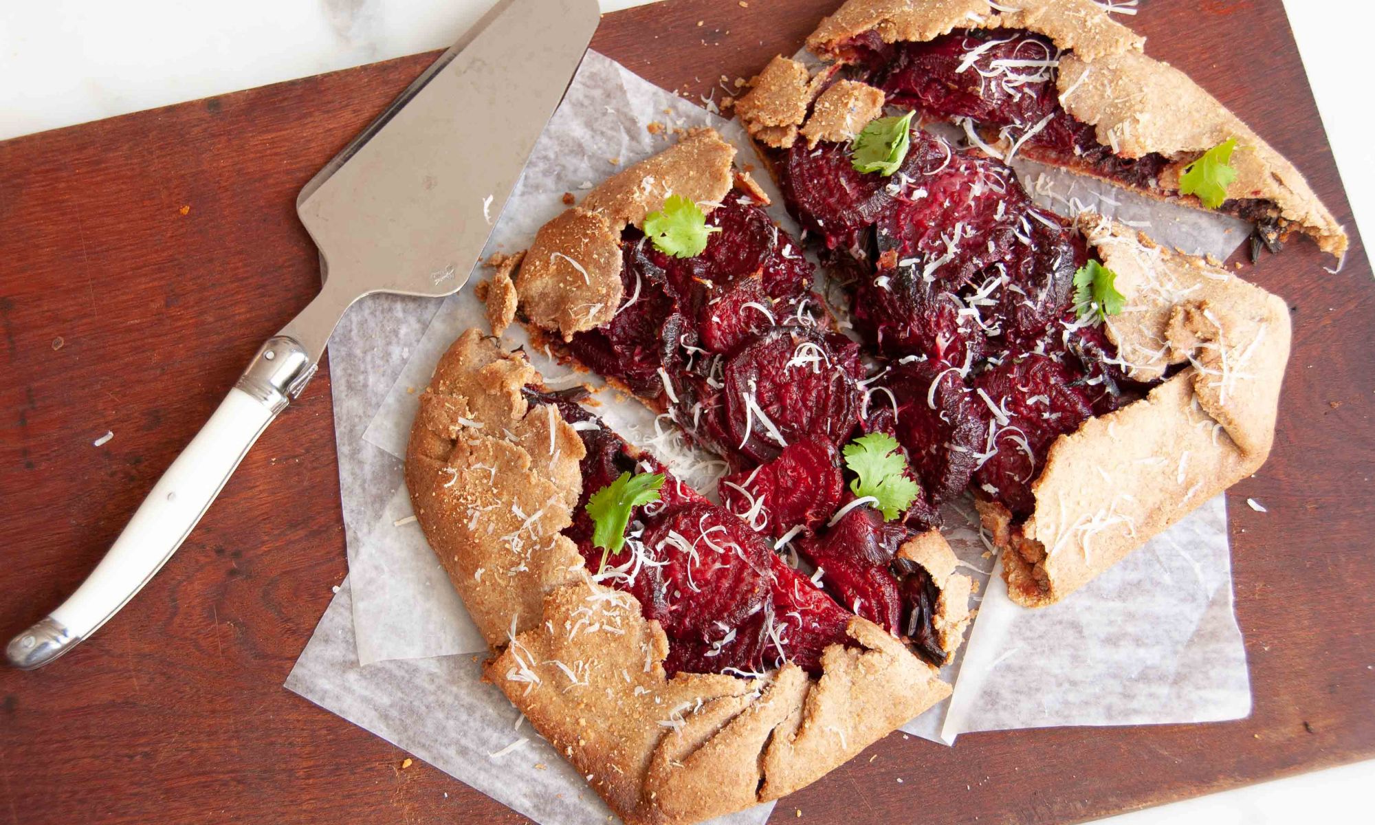 6.Cuando tengas el salteado listo, estira la masa sobre papel manteca o un silpat y dejando 3 cm de masa sin ocupar de todos lados, coloca en el centro el salteado y encima las rodajas de remolacha. Dobla los lados de la masa sobre el relleno y pintalos con un poco de doradura o aceite y llevalo a un horno fuerte por 20/25min hasta que la masa se dore.